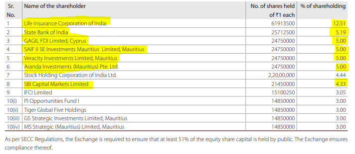 NSE has premier shareholders: in FY2017, the government-owned Life Insurance Corporation (LIC) had a 12.5% stake, followed by the State Bank of India (SBI) group with 9.5% (SBI-5.2% and SBI Capital Markets 4.3%) shareholding, and foreign shareholders as well had their representatives on the NSE board. The government-owned institutions manage public funds, and their representatives, along with the public interest directors, had a fiduciary responsibility to monitor the executive management of the NSE.