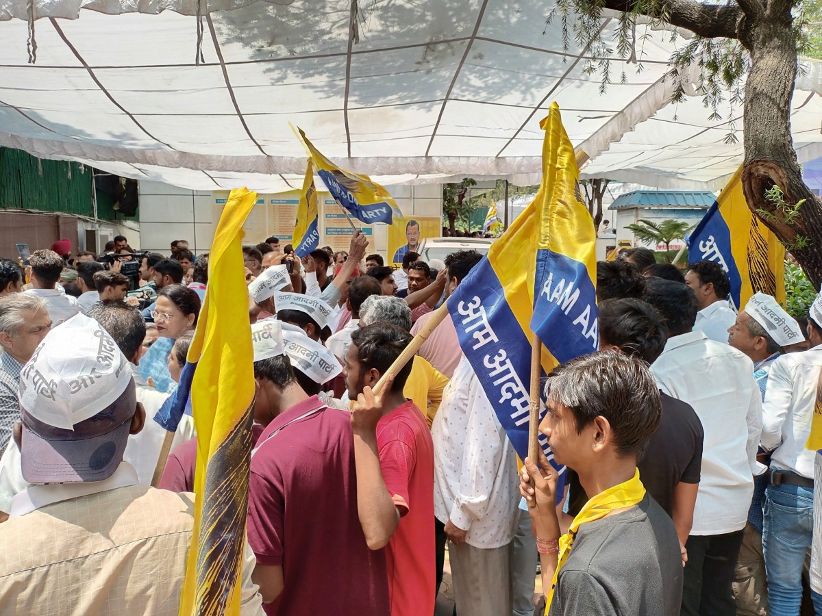 A group of supporters carrying flags in support of AAP. Photo: Abhishek Dey.