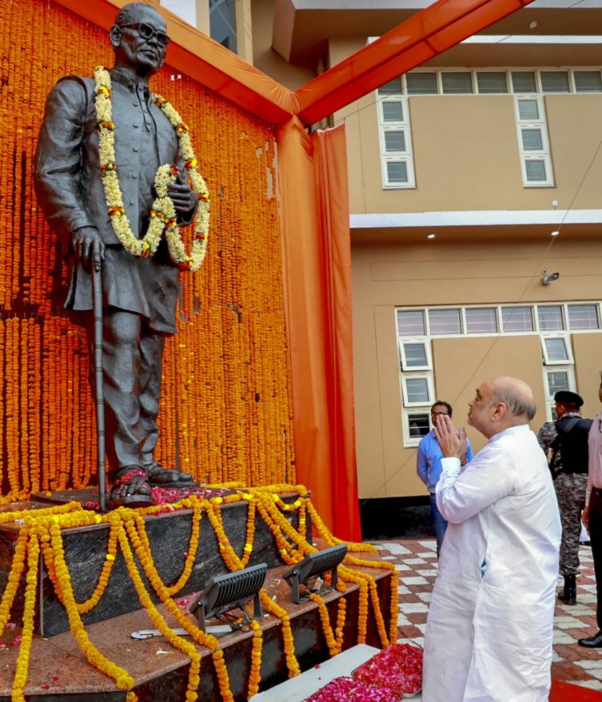 Union home minister Amit Shah pays tribute after unveiling a statue of Loknayak Jayaprakash Narayan, in Sitab Diara, Bihar, Tuesday, October 11, Photo: PTI.