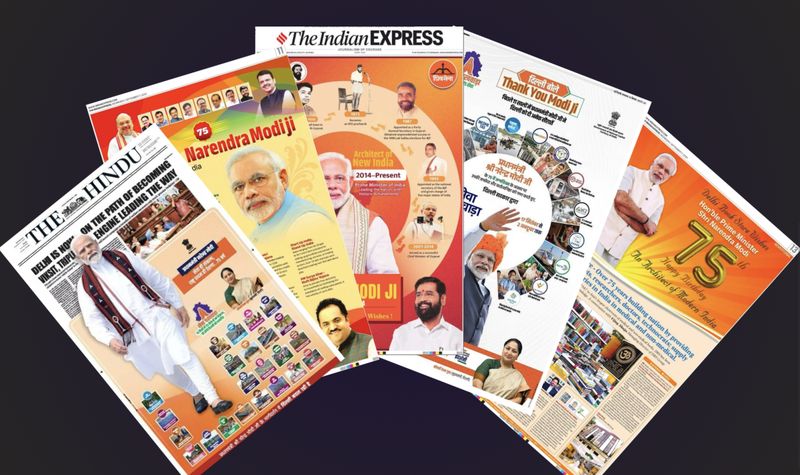 Delhi editions of The Times of India, The Indian Express, Hindustan Times, The Hindu also opened with front page ads by Delhi chief minister Rekha Gupta wishing Modi on his birthday and listing his achievements.