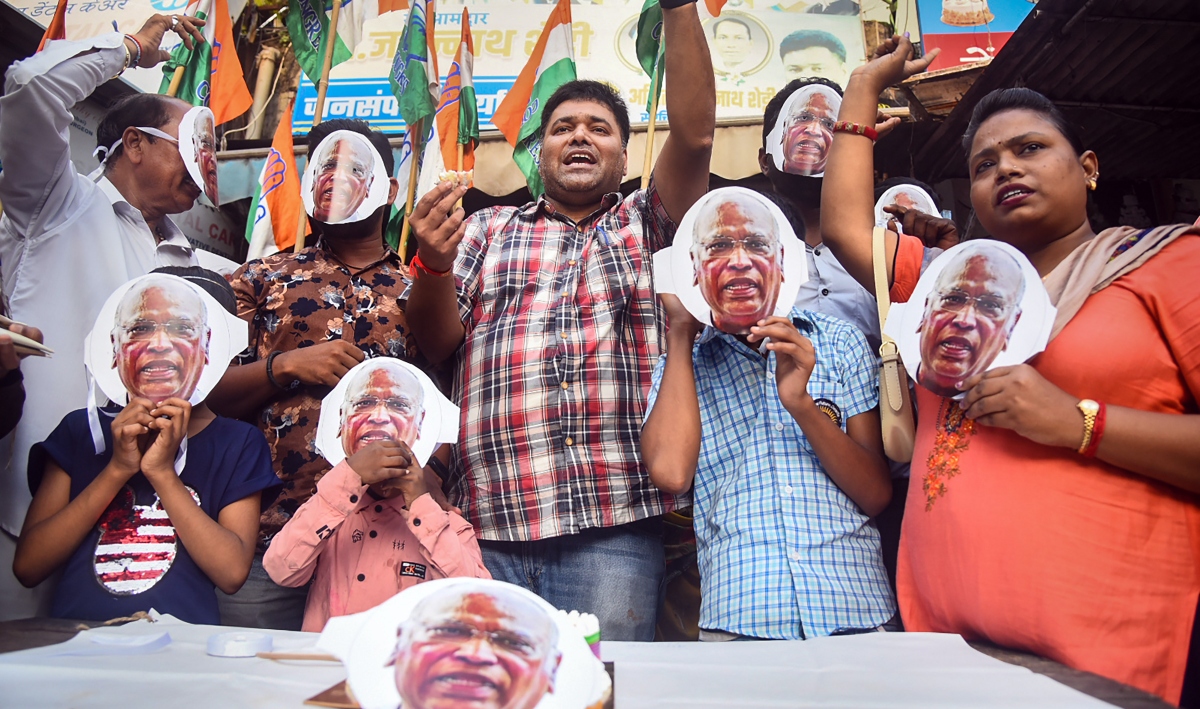 Congress workers celebrate after senior party leader Mallikarjun Kharge won the party's presidential election, in Mumbai, October 19, 2022. Photo: PTI