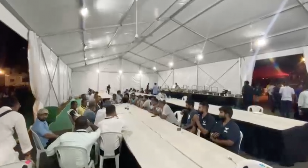 Congress workers on the Bharat Jodo Yatra, eat at a tent. Photo: By arrangement