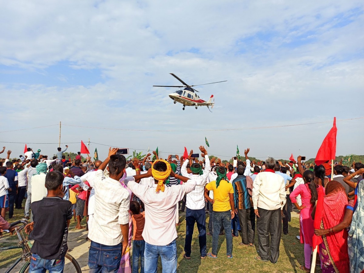 A corridor had been set up leading from the helipad to the stage. As people gathered around the helipad, an announcement was made: “Our Tejashwiji will be arriving in about an hour. Please, do not keep standing. Do not gather near the helipad.”