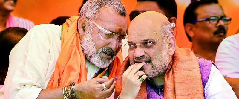 BJP president Amit Shah and Giriraj Singh during an election campaign rally in Begusarai district. Photo: PTI
