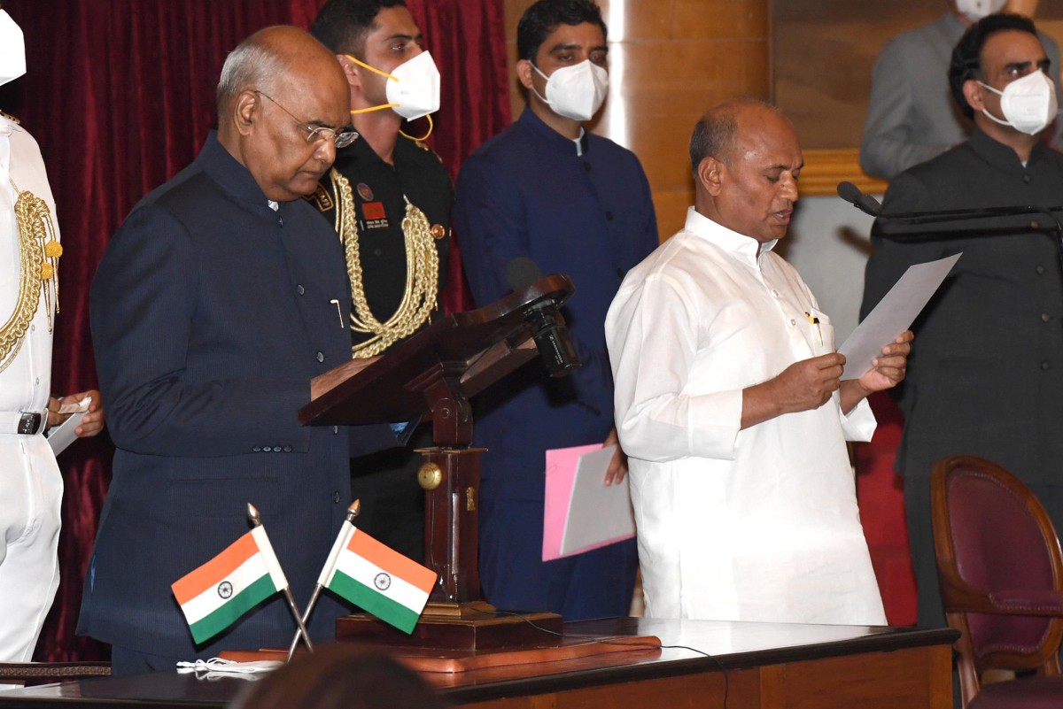 President Ram Nath Kovind administers oath to Ramchandra Prasad Singh as a Cabinet Minister, at a swearing-in ceremony at the Rashtrapati Bhavan, in New Delhi Wednesday, July 7, 2021. Photo: PTI