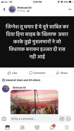 Apart from hobnobbing with orthodox Muslim parties, Ali had also used a casteist slur against Jignesh Mevani, independent MLA from Gujarat's Vadgam, on his Facebook profile while criticising Mevani’s support to Amarnath Yadav, a CPI (ML) candidate from Siwan, during the 2019 general elections,. His grouse against Mevani was that he supported Yadav instead of Hena Shahab, the Rashtriya Janata Dal candidate. He has earlier objected to Mevani’s support to the CPI candidate Kanhaiya Kumar in Begusarai. Ali, who claimed he had supported Mevani’s candidature in Vadgam, expected him to ally with the RJD’s Muslim candidate Md Tanveer Hasan.