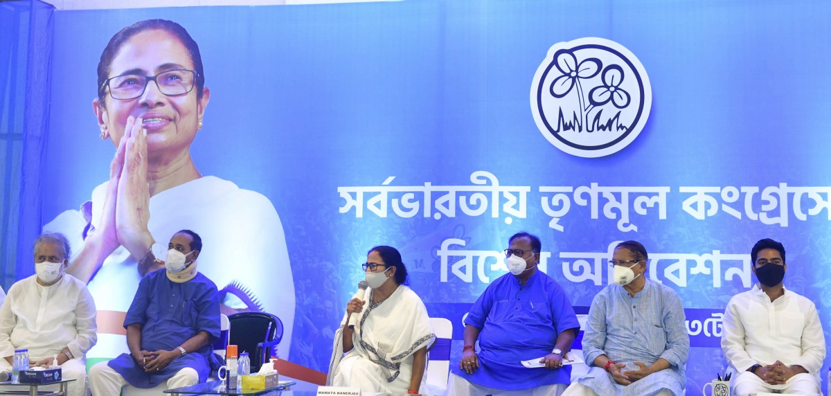 West Bengal Chief Minister Mamata Banerjee addresses TMC Core Committee meeting at TMC Bhawan in Kolkata. Photo: PTI