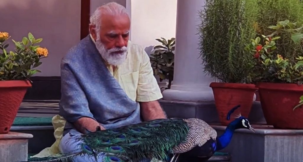PM Narendra Modi with a peacock. Photo: Instagram/@narendramodi