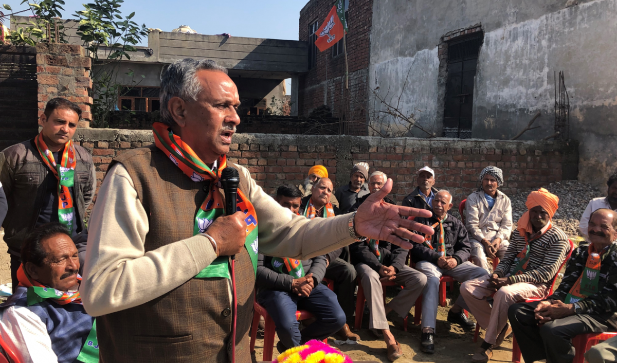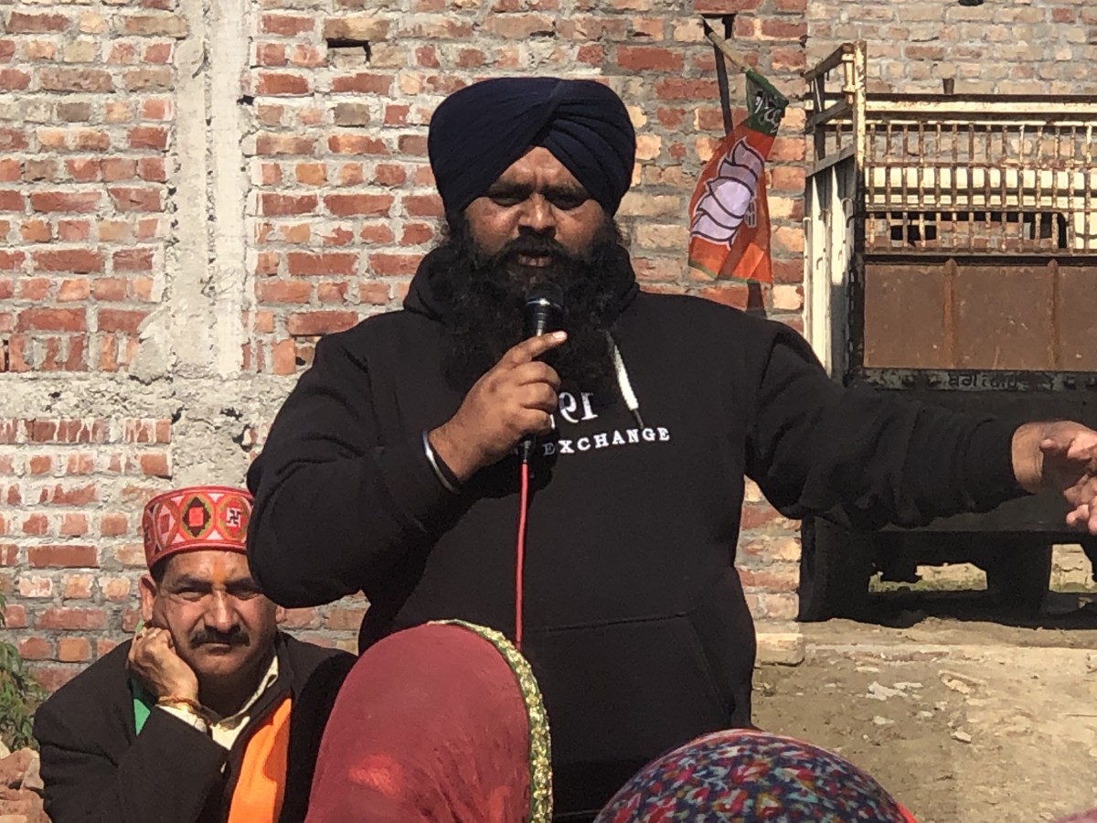 A farmer activist, Inderjit Singh Khalsa, campaigns for BJP’s Jangi Lal Mahajan in Mukerian to capture peasantry votes. Photo: Prabhjit Singh