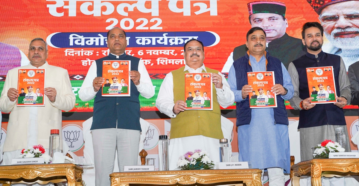 BJP national president J.P. Nadda along with Union minister Anurag Thakur, Himachal Pradesh chief minister Jai Ram Thakur and others release the BJP's manifesto for the upcoming Himachal Pradesh assembly elections, in Shimla, November 6, 2022. Photo: PTI