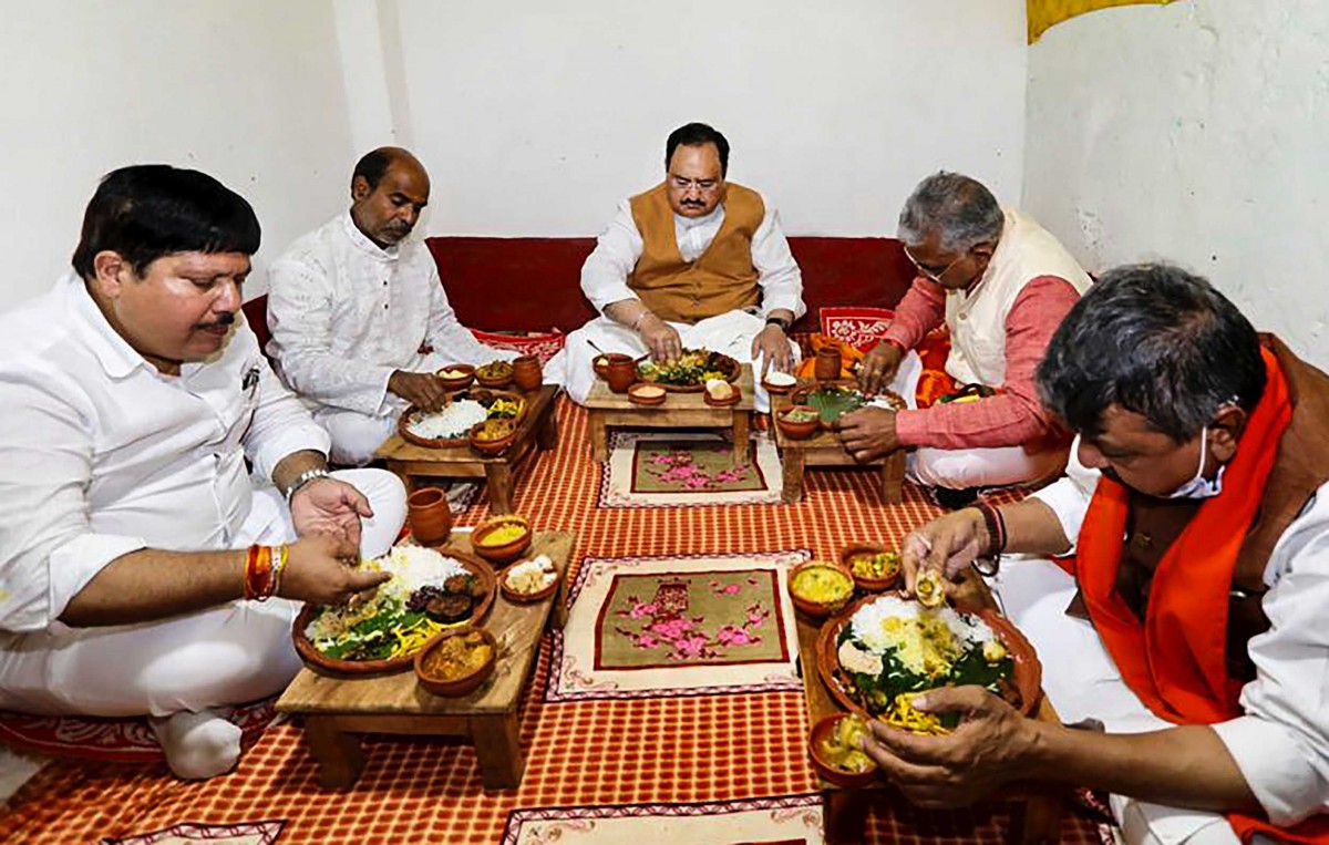 BJP National President JP Nadda having lunch in jute mill workers household, in Gouripur, Thursday, Feb. 25, 2021. Photo: PTI