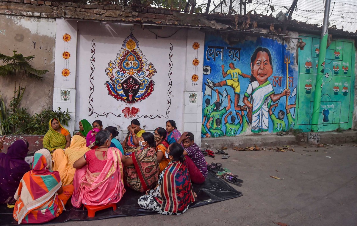 Women sit near a wall graffiti with slogan Khela Hobe, in support of TMC, ahead of the State Assembly elections in Kolkata, Saturday, Feb. 27, 2021. Photo: PTI/Swapan Mohapatra