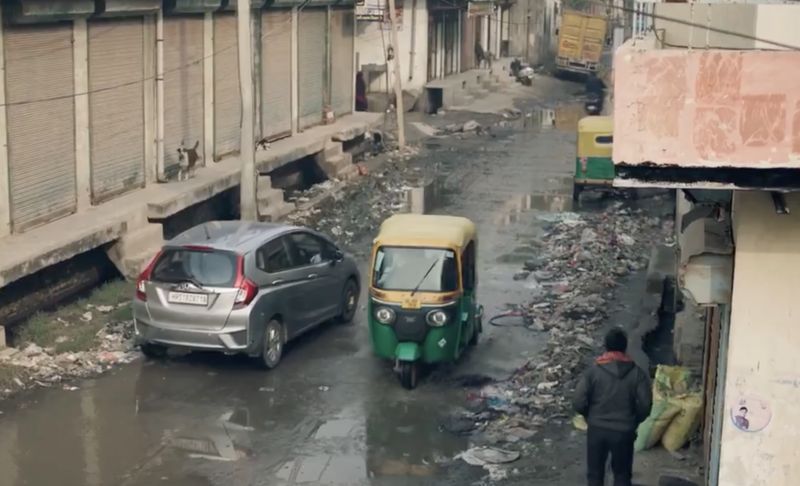 By comparing the video with Google Street View images of the location, we confirmed that the video was filmed in Faridabad. The muddy and broken road seen in the first frame of the video matche a street in Faridabad near Thakur Udaypal Dharamshala. (Location coordinates)