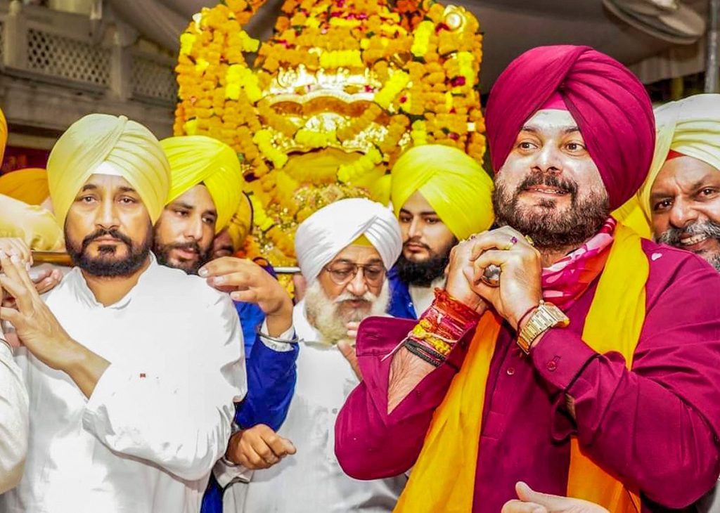 Punjab chief minister Charanjit Singh Channi and PPCC president Navjot Singh Sidhu perform the voluntary service of carrying the palanquin of Guru Granth Sahib during their visit to pay obeisance at the Golden Temple in Amritsar, September 22, 2021. Photo: PTI