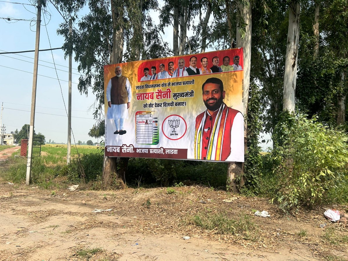 Posters of Haryana Chief Minister Nayab Singh Saini and Prime Minister Narendra Modi dot Ladwa. Photo: Sravasti Dasgupta