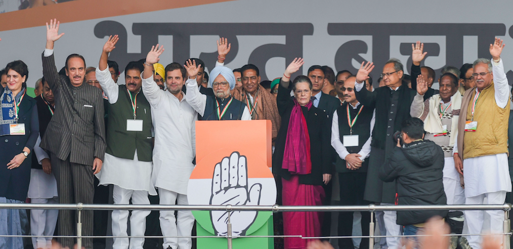 Senior Congress leaders at the 'Bharat Bachao' rally held at Ramlila Maidan in New Delhi on December 14, 2019. Photo: PTI