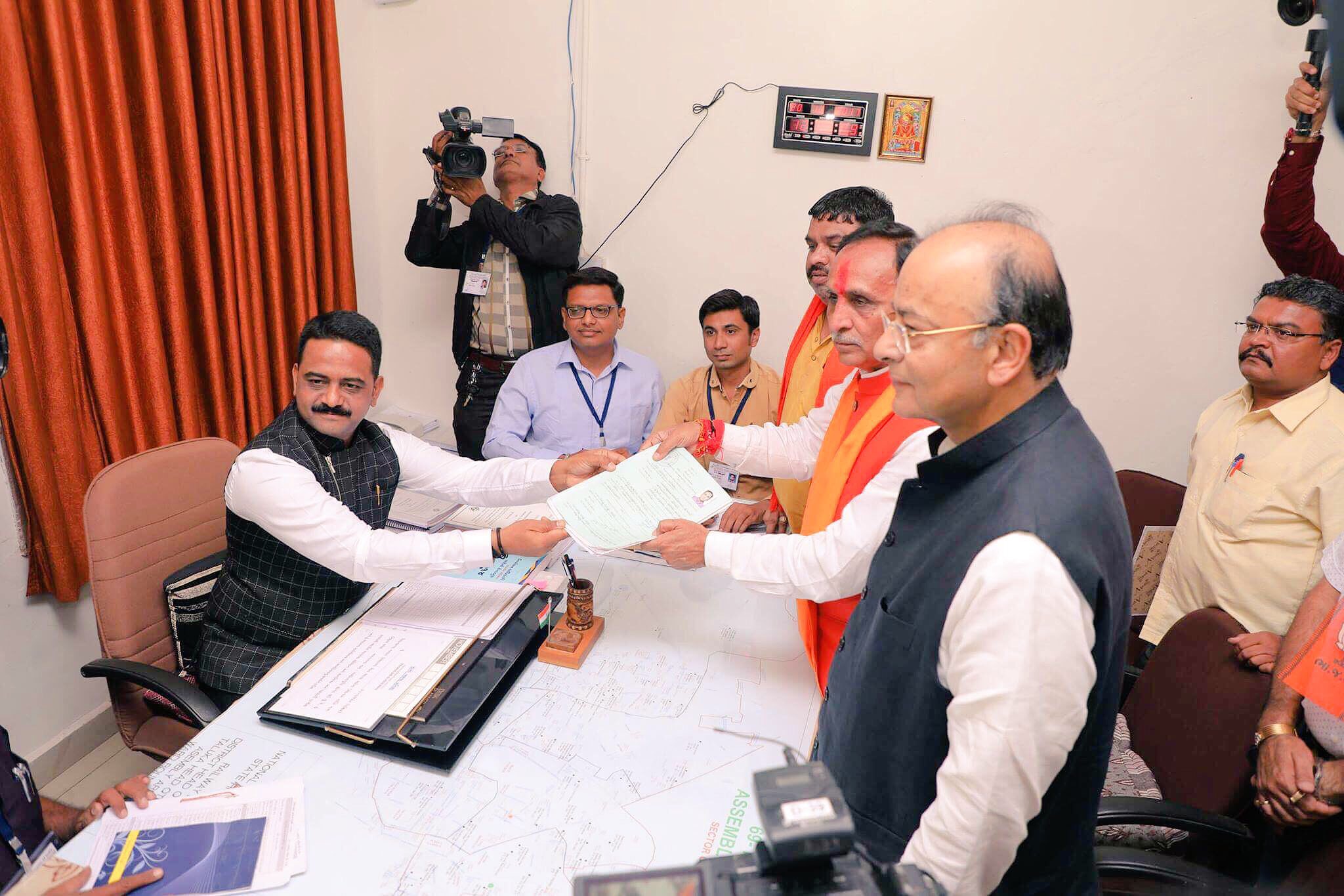 Gujarat chief minister Vijay Rupani files his nomination in the presence of Union finance minister Arun Jaitley. Credit: Damayantee Dhar