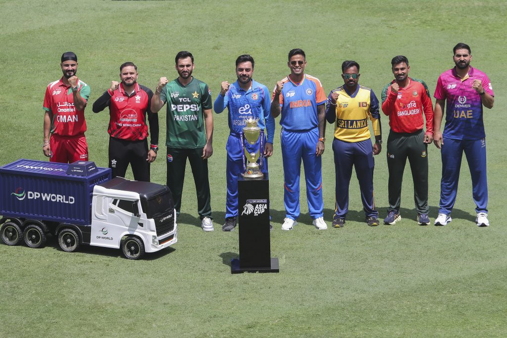 In this image released on Sept. 9, 2025, from left, Oman captain Jatinder Singh, Hong Kong captain Yasim Murtaza, Pakistan captain Salman Ali Agha, Afghanistan captain Rashid Khan, India captain Suryakumar Yadav, Sri Lanka captain Charith Asalanka, Bangladesh captain Litton Das and UAE captain Muhammad Waseem during the unveiling of the Asia Cup 2025 trophy, in Dubai. Photo: Creimas/Asian Cricket Council via PTI.