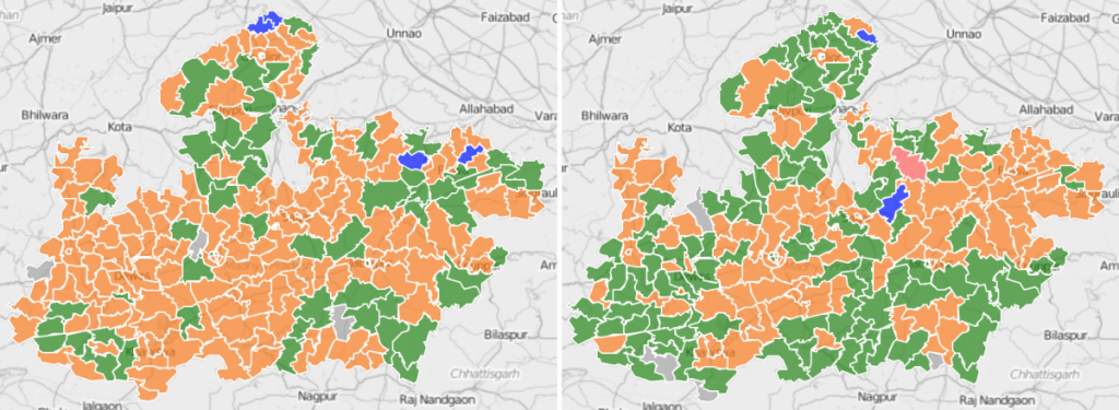 Assembly election results for 2013 (left) and 2018 (right)in Madhya Pradesh. Credit: newsclick.in