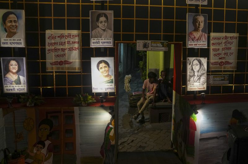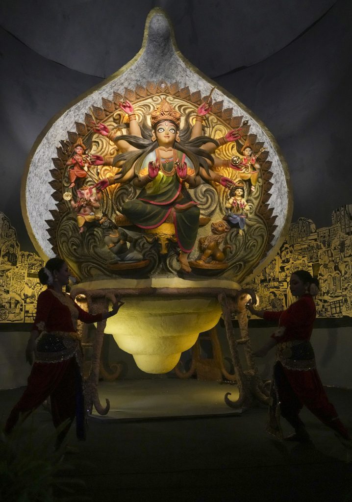 Artists perform at Chaltabagan Durga Puja pandal themed on 'mool' (roots) and the 'evolution of Bengali language', in Kolkata, Saturday, Sept. 27, 2025. Photo: PTI.