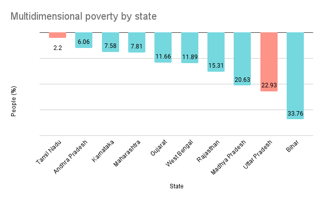 Bihar has 33.8% poor, Uttar Pradesh 22.9% and Madhya Pradesh 20.6%.