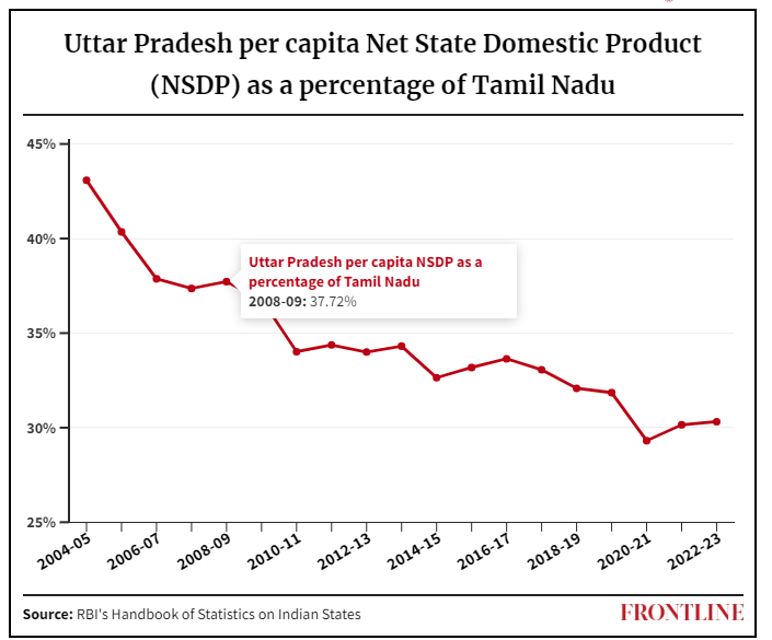 Credit: Frontline magazine. Source: https://ptrmadurai.com/has-uttar-pradesh-s-economy-surpassed-tamil-nadu.
