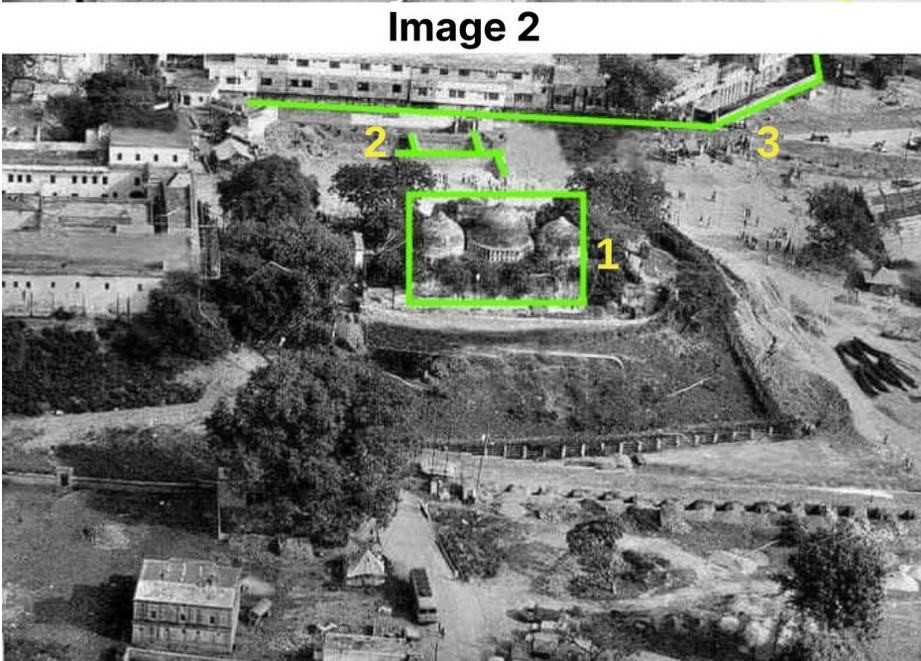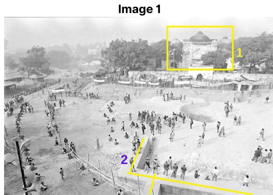 We looked up the internet and found several pictures of the now-demolished Babri Masjid. In two of these photographs shot from two opposite sides of the mosque (Image 1 and Image 2 below), the Babri Masjid and some unidentified structures are visible, and in only one (Image 2), a sprawling building nearby can be seen. We matched these with the satellite image from 2011.