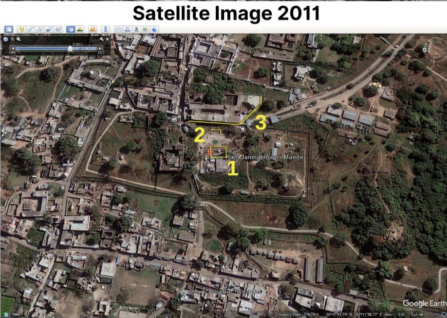 The part marked as 1 is the Babri Masjid. This is visible from two sides in Image 1 and Image 2. The structure marked as 2 in Image 1, Image 2 and Satellite Image from 2011 below is a concrete plinth beam-like structure adjacent to a building close to the Babri Masjid. The building marked 3 is also visible in Image 2 and the 2011 satellite image. In this way, when we compare the structures present in Image 1 and Image 2 with the satellite images from 2011 and 2023, we can see that the Ram Mandir is being built at the same site where the Babri Masjid once stood.