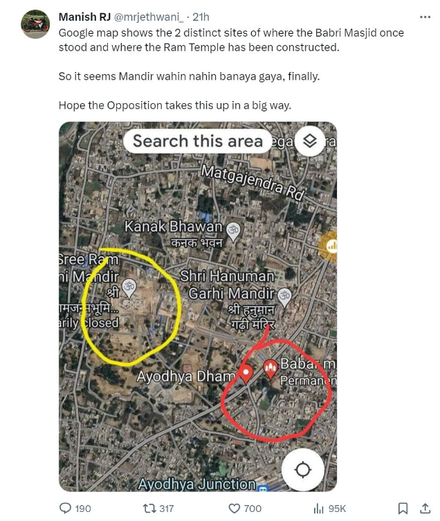 A user named Manish Jethwani tweeted the Google Maps screenshot in which two locations were circled. One of these signified the temple being built in Ayodhya, while the other read ‘Babar Masjid (permanently closed)’. While sharing this, the user claimed that the Ram Mandir was not being built at the site where the Babri Masjid was demolished, but at another location. (Archived link)