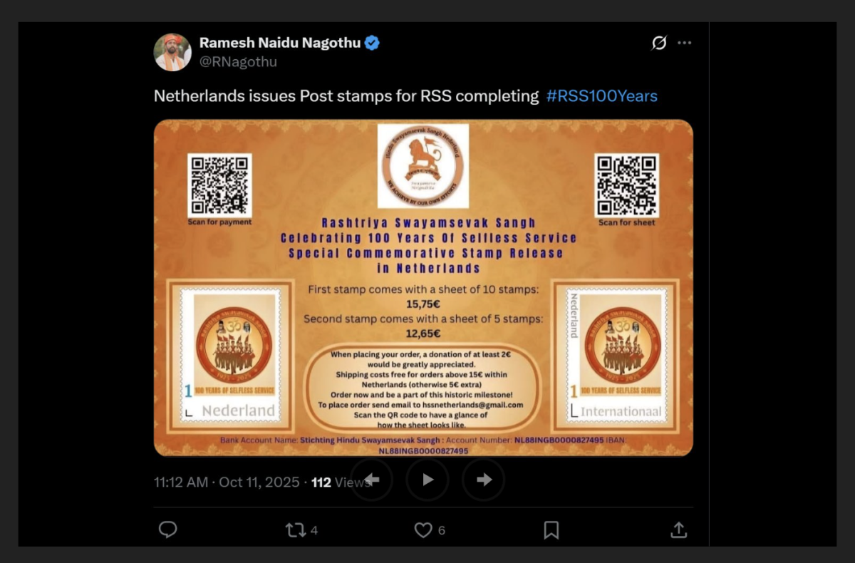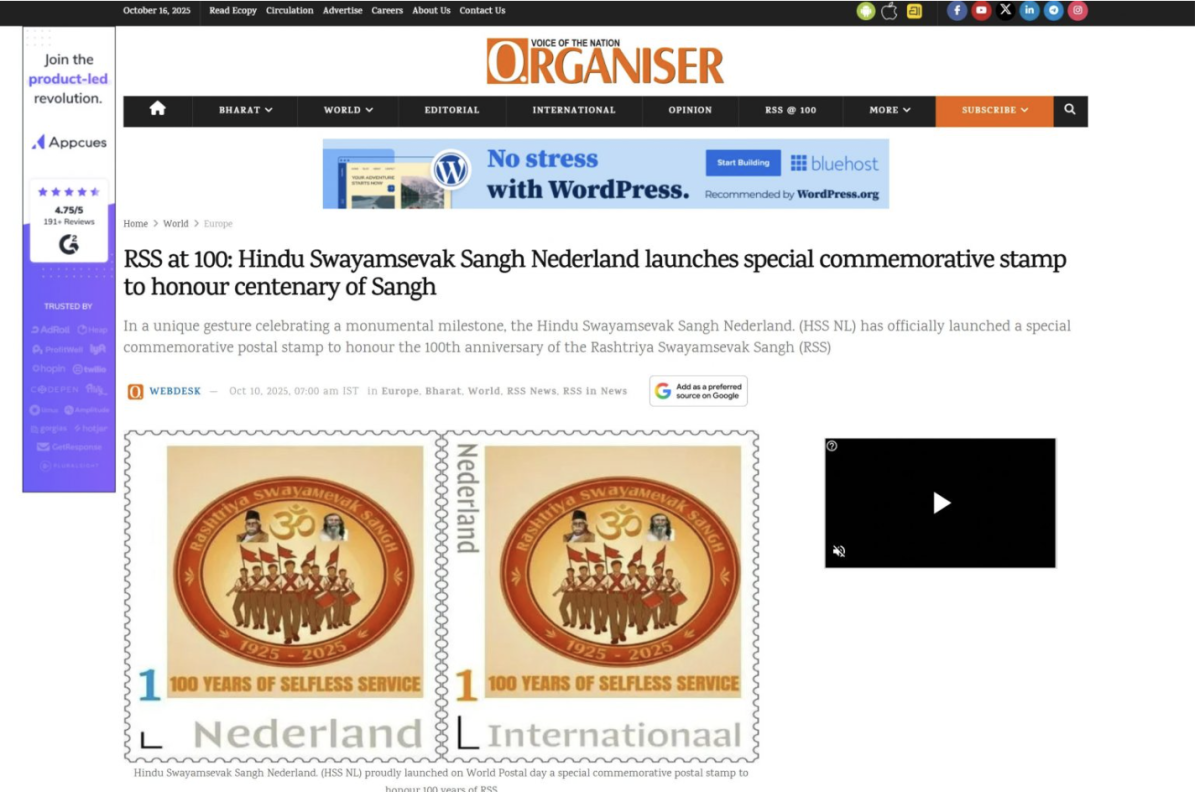 The report stated, “To honour this monumental milestone, Hindu Swayamsevak Sangh Nederland. (HSS NL) proudly launched on World Postal day a special commemorative postal stamp – a symbol of one hundred years of unity, discipline, and devotion to the world’s universal Dharma”. (sic)