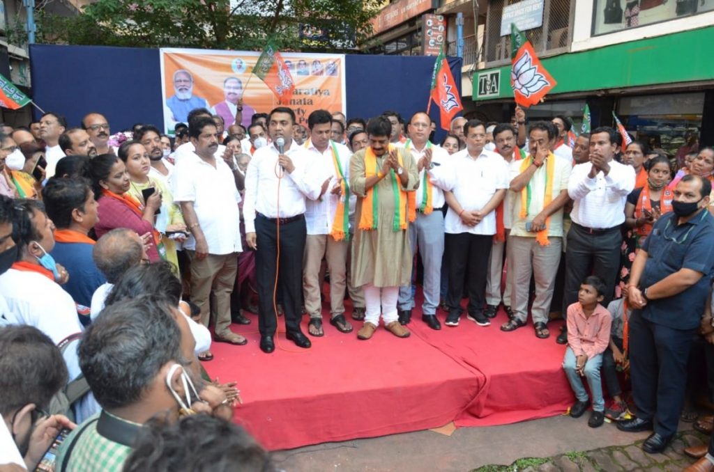 Goa chief minister Pramod Sawant, state BJP chief Sadanand Tanavade inducting Saligao MLA Jayesh Salgaonkar. Photo: BJP4Goa.