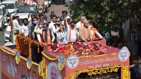 Gujarat BJP president C.R. Patil and other senior leaders during an election campaign for civic body elections in Ahmedabad. Photo: PTI
