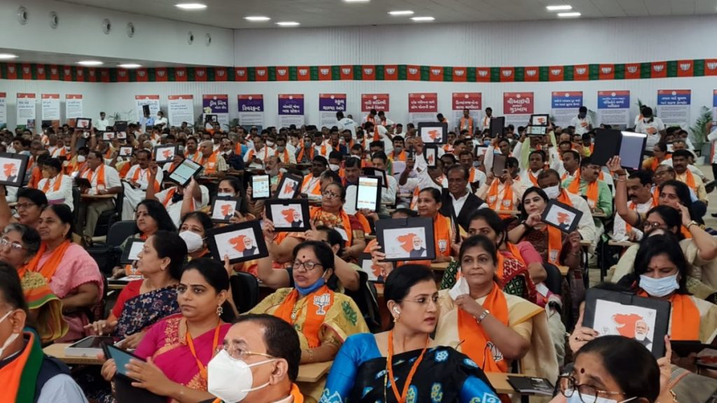 BJP members at the party's Gujarat state executive meet in Kevadia, September 2, 2021. Photo: Twitter/@Bhupender Yadav