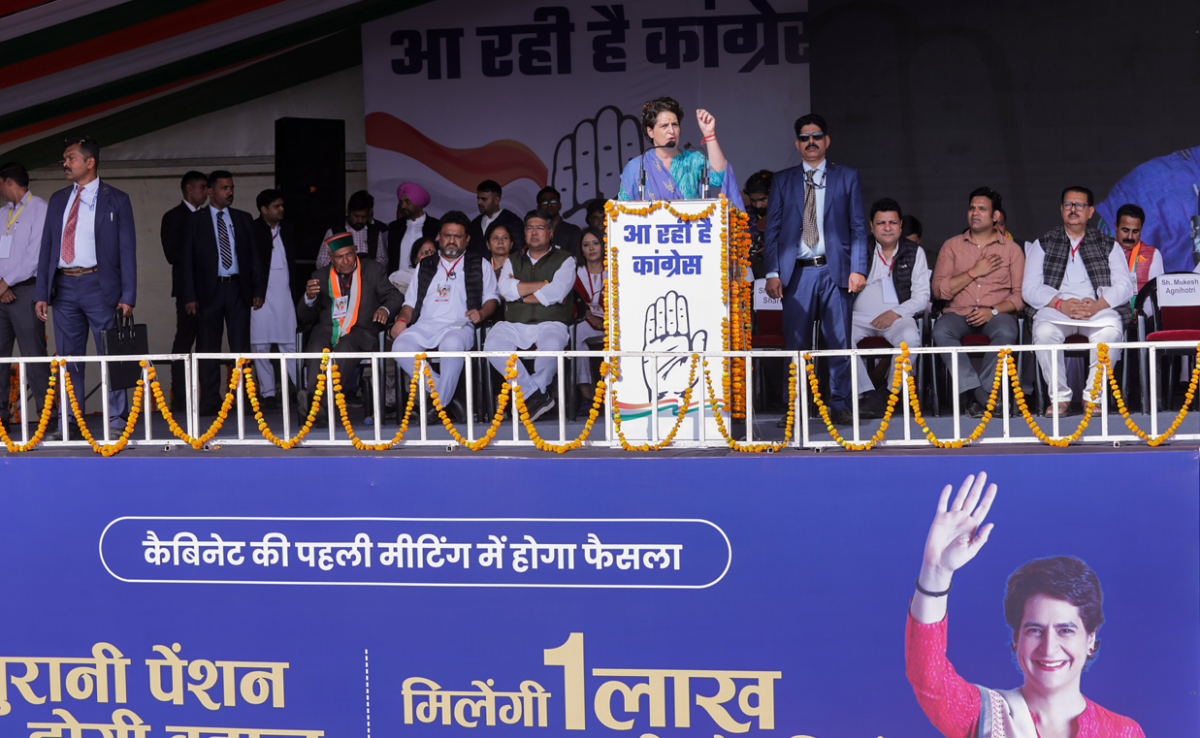 Kangra: AICC General Secretary Priyanka Gandhi Vadra addresses during a public meeting ahead of Himachal Pradesh Assembly polls, in Kangra district, Friday, November 4, 2022. Photo: PTI