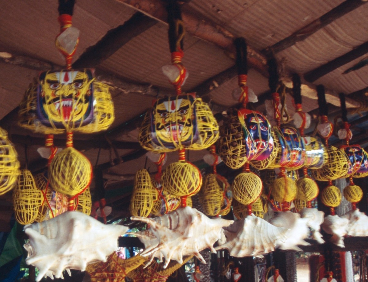- A portrait with a black face, horns, and a big moustache with its tongue out is placed in front of new and old houses. A large pumpkin, with the same face painted on it, is tied in front of a house. A white stone or a conch shell wrapped in a black thread may also be used.