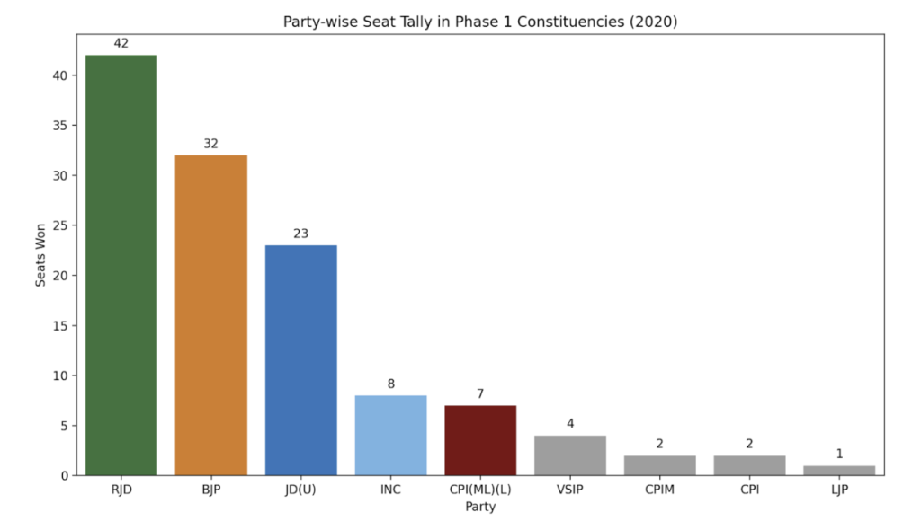 Individual party performances established a clear hierarchy. The Rashtriya Janata Dal (RJD) was the single largest party with 42 seats. The Bharatiya Janata Party (BJP) was second with 32 seats. The Janata Dal (United) finished third with 23 seats. The remaining seats were won by the Congress (INC) with 8, CPI(ML)(L) with 7, Vikassheel Insaan Party (VSIP) with 4, CPIM with 2, CPI with 2, and the Lok Janshakti Party (LJP) with 1.