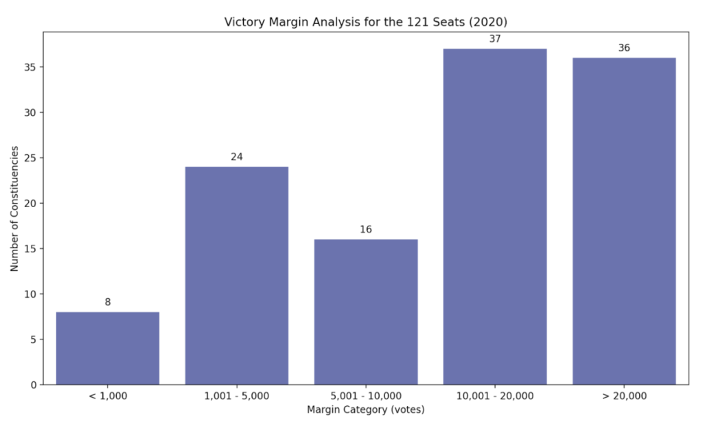 In an overall marginal analysis, the distribution of victory margins reveals the competitive nature of the election. The 121 seats were decided across the following bands:
