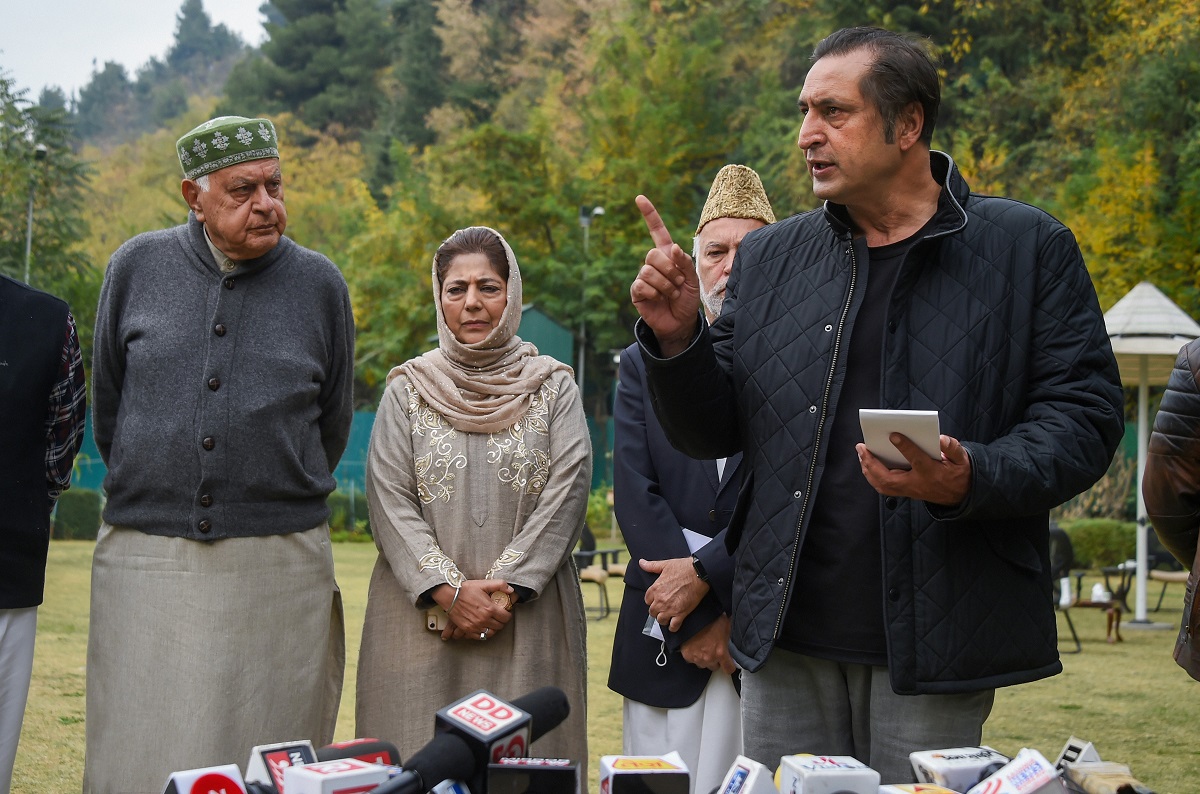 National Conference leader Farooq Abdullah and PDP chief Mehbooba Mufti look on as People's Alliance for Gupkar Declaration spokesperson Sajad Lone speaks. Photo: PTI/S. Irfan.