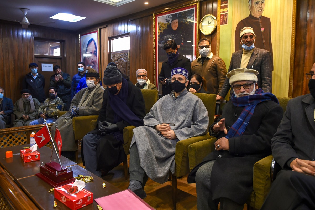 National Conference President Farooq Abdullah, Vice President Omar Abdullah and other senior leaders during a meeting with party workers to celebrate the results of DDC and municipal elections, in Srinagar, Wednesday, December 23, 2020. Photo: PTI/S. Irfan