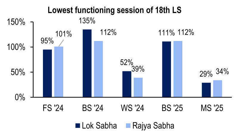 Both Houses functioned for about a third of their scheduled time. This was the lowest functioning seen during the 18th Lok Sabha.