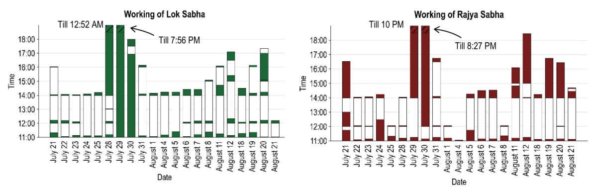 The functioning days were marked by disruptions. The House would repeatedly get adjourned during the day only to meet for a few minutes before adjourning again. This can be seen in the charts below.