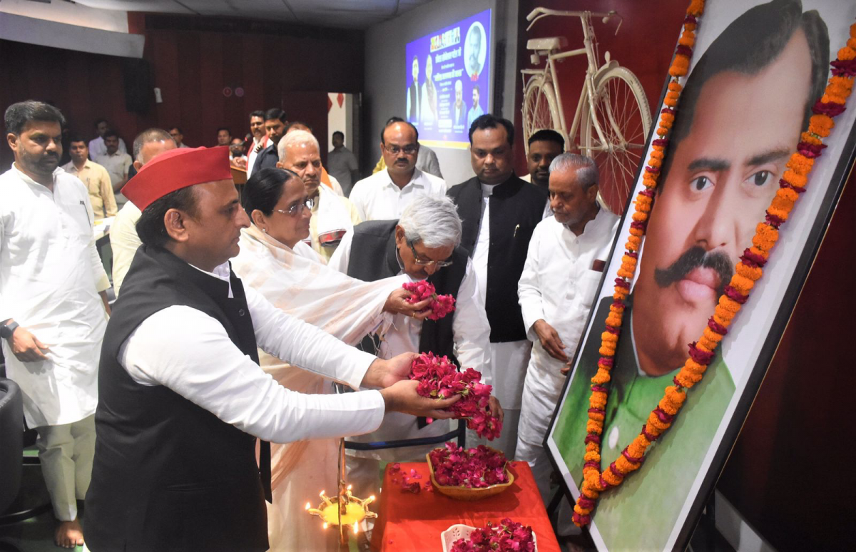 Akhilesh Yadav with Krishna Patel paying tribute to Sone Lal Patel on his birth anniversary. Photo: SP Office