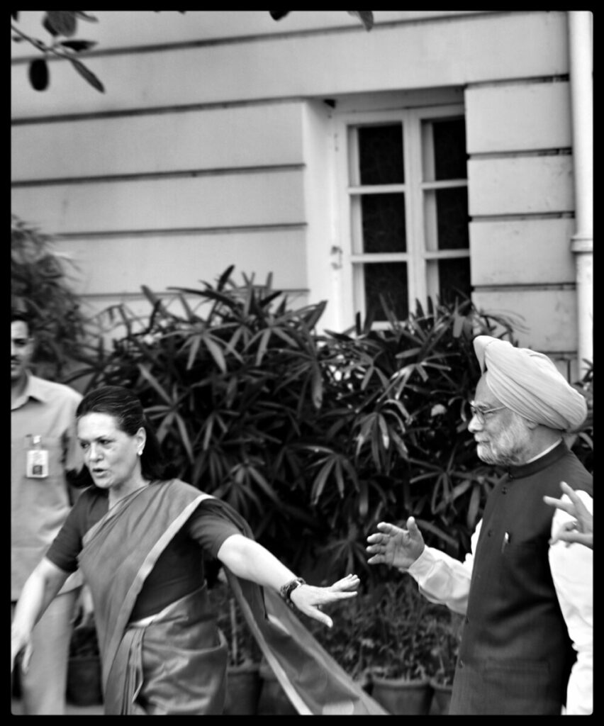 Manmohan Singh and Sonia Gandhi, as the latter requests him to take over as PM. Photo: Shome Basu.