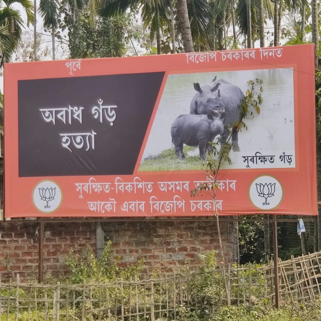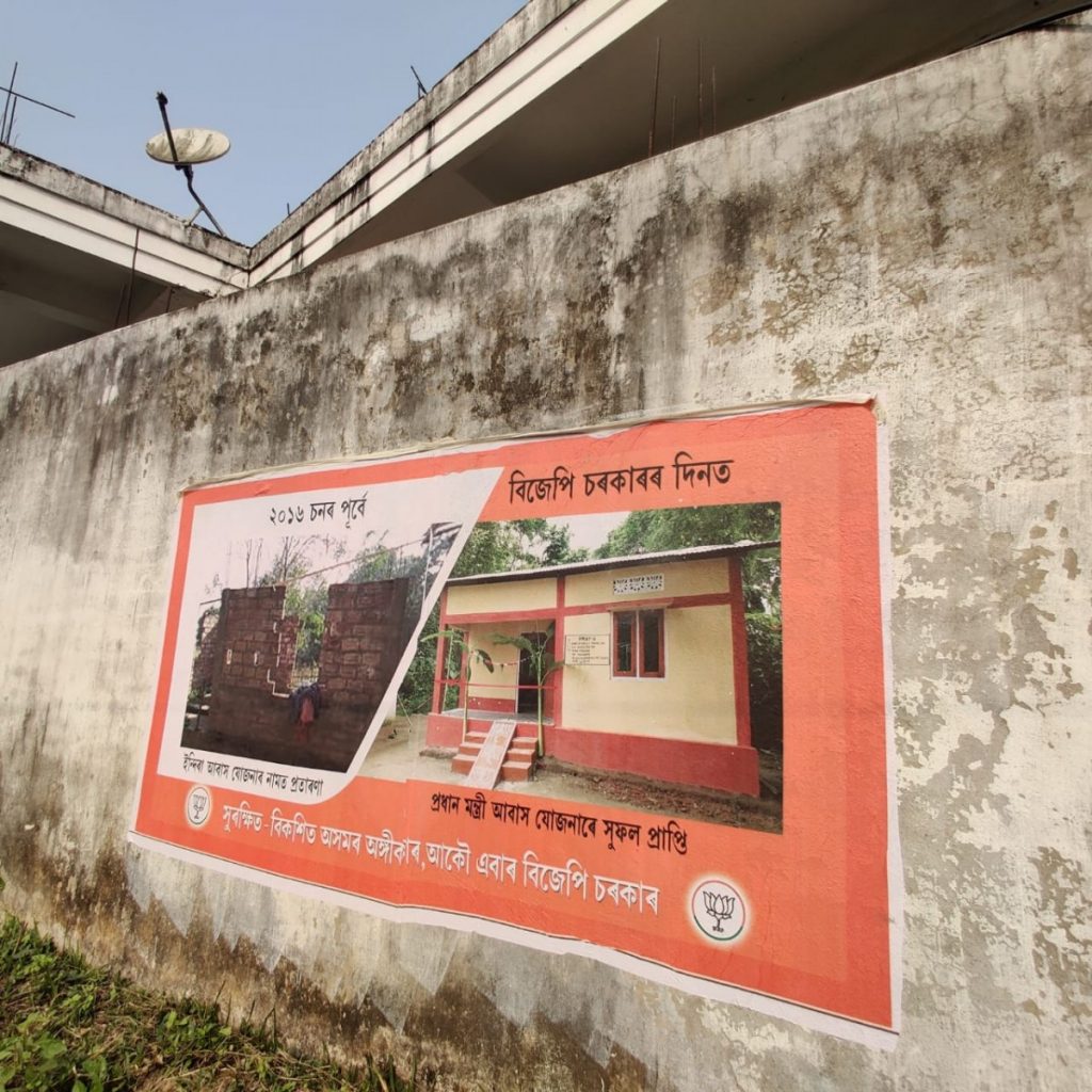 The Sarbananda Sonowal government is advertising itself as a vehicle of good governance. Throughout the Brahmaputra valley, the BJP's posters on public walls and billboards particularly highlight three claims: protection of the state's symbol, the one-horned rhino, from poaching; better delivery of houses in the state through the Pradhan Mantri Awas Yojana than that of the Indira Awas Yojana; and improving the condition of certain roads. These posters were spotted in the Samaguri constituency of Jorhat, one of the 47 assembly segment to go to the polls on March 27.