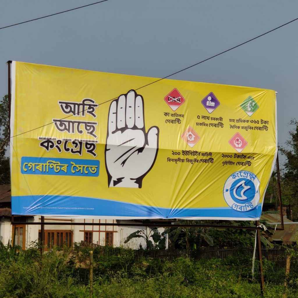 In contrast, the opposition Congress has promised people five deliverables if it comes to power. It promises to abolish the Citizenship Amendment Act, grant jobs to five lakh youth, give 200 units of free electricity, raise the daily wage of tea garden workers to Rs 365 and give Rs 2,000 to married women per month (as against the Rs 830 given by the Sonowal government). This billboard sighted in the Moran constituency, going to polls in the first of the three-phase elections in the state, highlights these promises.