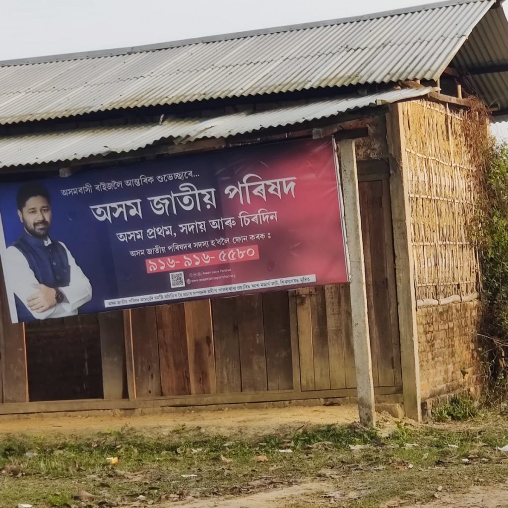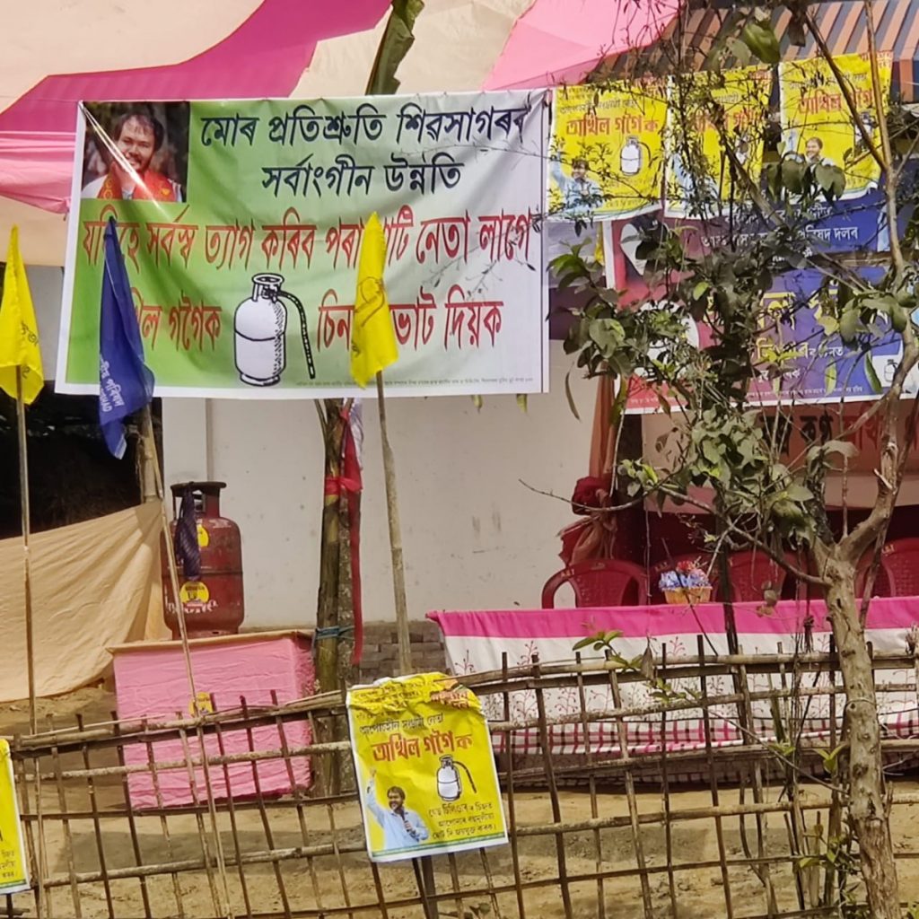 Apart from the BJP, its ally the Asom Gana Parishad, and the Congress, posters and signboard featuring Lurinjyoti Gogoi of the newly formed regional party Assam Jatiya Parishad and the incarcerated Akhil Gogoi, the face of its ally Raijor Dal, are also visible. This poster of the Assam Jatiya Parishad leader is from the Amguri constituency.