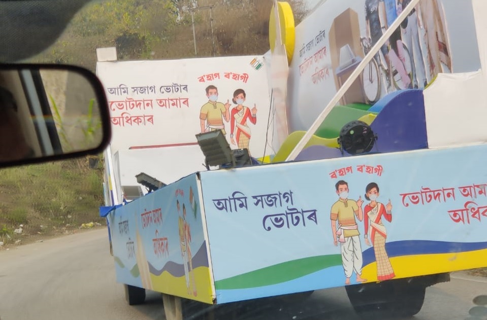 Meanwhile, the Election Commission of India has put up a number of posters and billboards across the state, prodding people to exercise their right to vote on March 27, April 1 and April 6. This shot is of a mobile promotional van of the ECI wheeling through the Koliabor constituency.