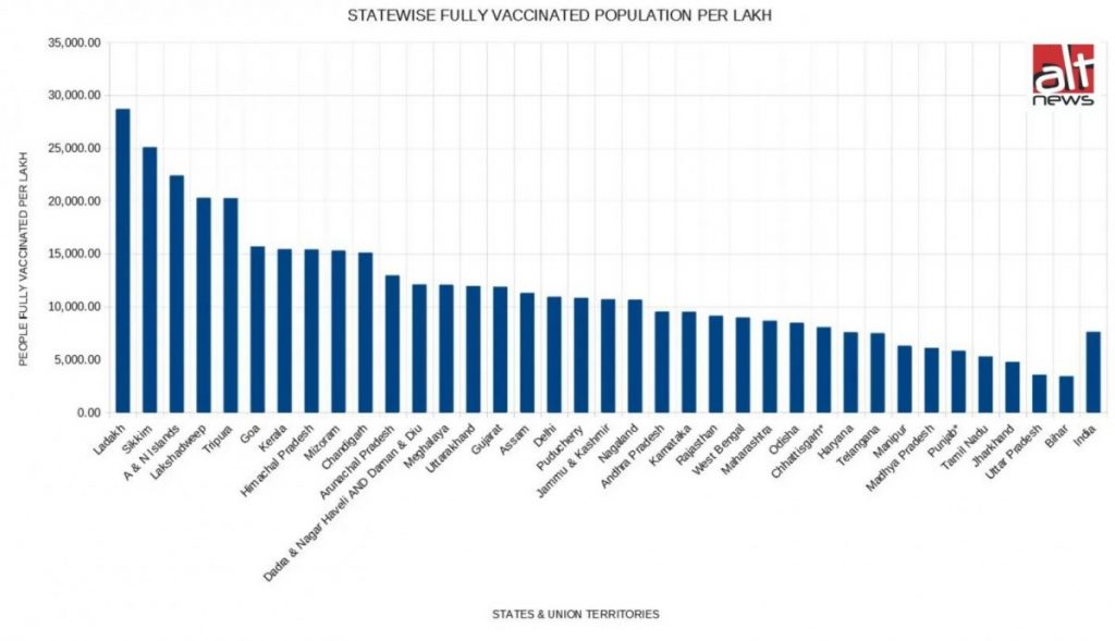 Alt News calculated the number of fully vaccinated people per lakh of population in each state based on the number of Aadhaar cardholders.