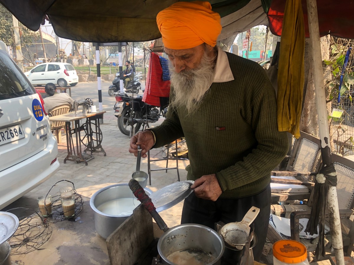 Elderly Jasbir Singh at his tea stall on Ghee Road in Amritsar. Photo: Kusum Arora
