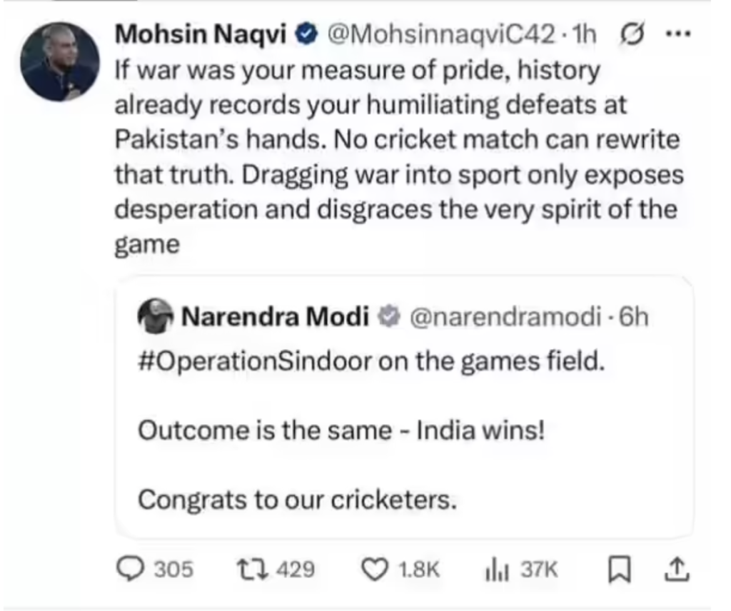 In response, reports Times of India, Mohsin Naqvi – whose account is withheld in India – wrote, "If war was your measure of pride, history already records your humiliating defeats at Pakistan's hands. No cricket match can rewrite that truth. Dragging war into sport only exposes desperation and disgraces the very spirit of the game."